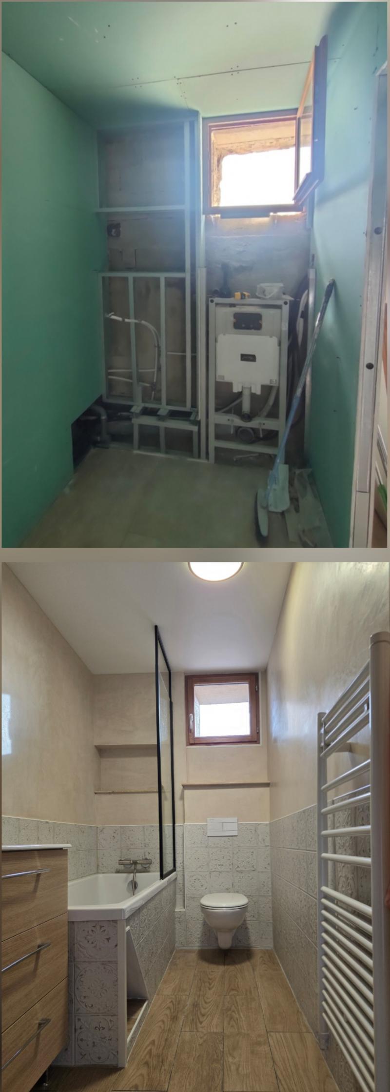 Les travaux ont compris la création des cloisons, l’intégration des équipements sanitaires, l’habillage des murs, la pose du revêtement de sol, l’installation de la baignoire, du meuble vasque, du WC suspendu et du sèche-serviettes. L’association des teintes claires, du carrelage décoratif et du sol imitation bois permet d’obtenir un rendu lumineux, harmonieux et contemporain.